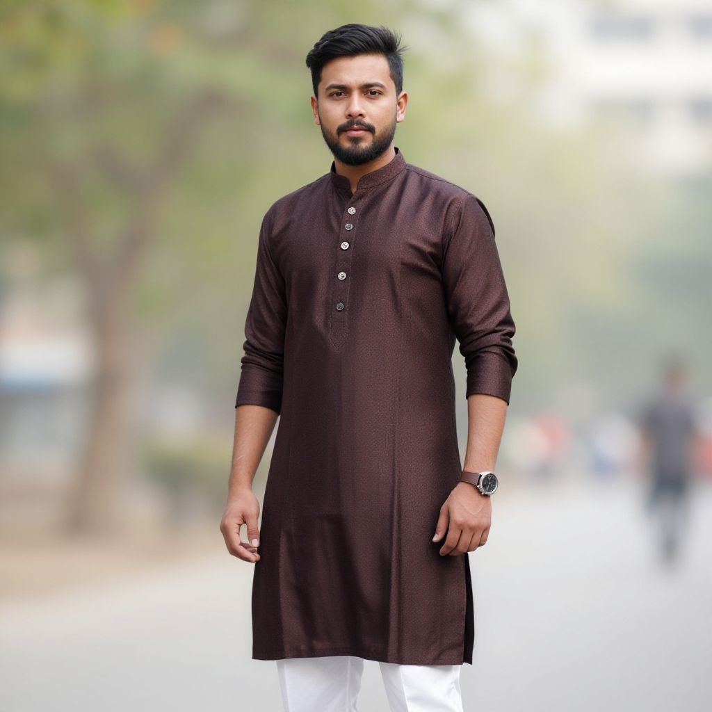 Photograph of a handsome South Asian man with a medium build, short black hair, and a trimmed beard. He stands outdoors against a blurred background of green trees and indistinct people. He wears a dark brown, long-sleeved, button-up traditional Pakistani kameez with white pants peeking out at the bottom. His right wrist has a black watch. His expression is serious, and he gazes directly at the camera. The lighting is natural, highlighting his facial features and the texture of his kameez.