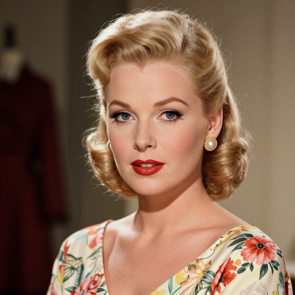 A vibrant 1950s-style portrait poster featuring a glamorous woman with blonde hair styled in a classic updo, adorned with elegant pearl earrings and wearing a floral-patterned dress, rendered in a high-definition digital art medium reminiscent of Everett's iconic photography from the 1950s.
