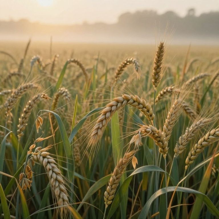 Close-up of diverse getreidearten growing in a lush field at sunrise, capturing intricate textures of oats, rye, and spelt, soft morning mist and golden light creating a serene and fertile landscape, impressionist painting effect emphasizing natural growth and biodiversity.
