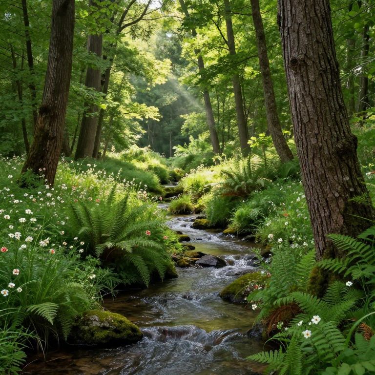 Photograph of a lush, sunlit forest with a flowing creek, ferns, white wildflowers, and tall trees, creating a serene, natural