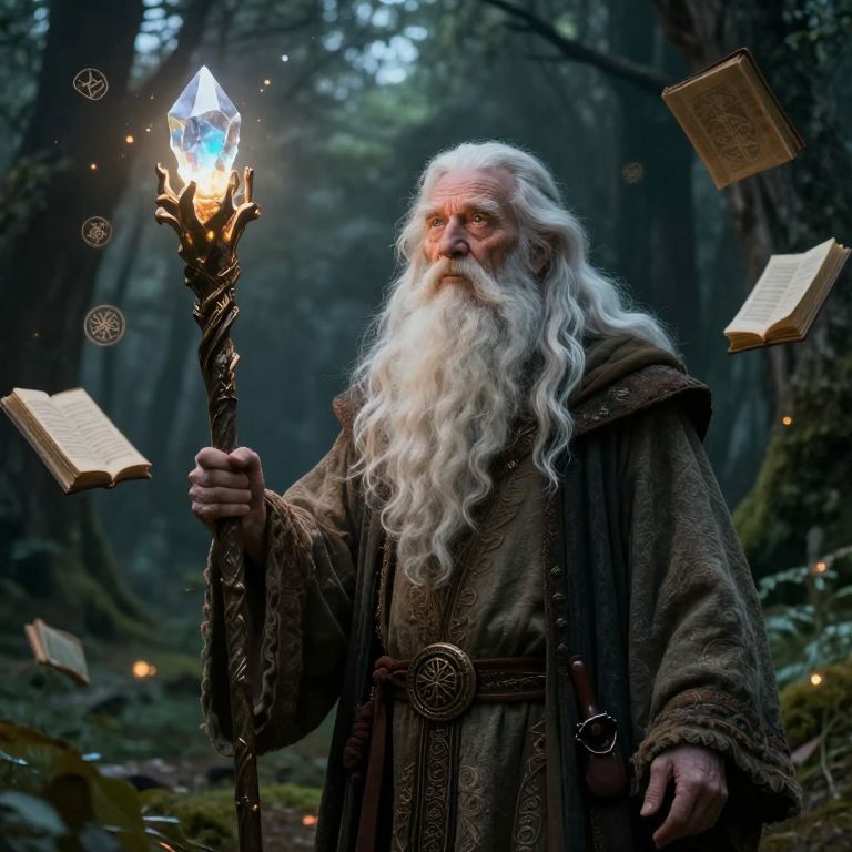 Elderguru in a mystical forest clearing, holding a staff topped with a glowing crystal, surrounded by floating books and magical symbols, aged face with long white beard, serene expression, dramatic lighting and detailed environment, inspired by high fantasy illustrations.