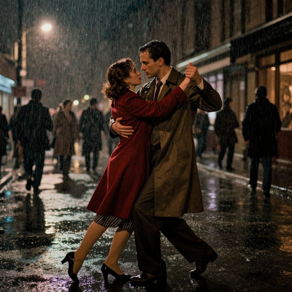 A photograph capturing a romantic dance scene on a rain-soaked city street at night. A man in a brown trench coat and dark suit holds a woman in a red coat and striped dress, both wearing black heels. They dance under streetlights, with raindrops visible. The background features blurry silhouettes of pedestrians and illuminated storefronts, creating a nostalgic, 1940s-style ambiance. The wet pavement reflects the lights, adding a glossy texture to the scene. The couple's intimate gaze and close embrace convey a sense of passion and connection amidst the urban setting.