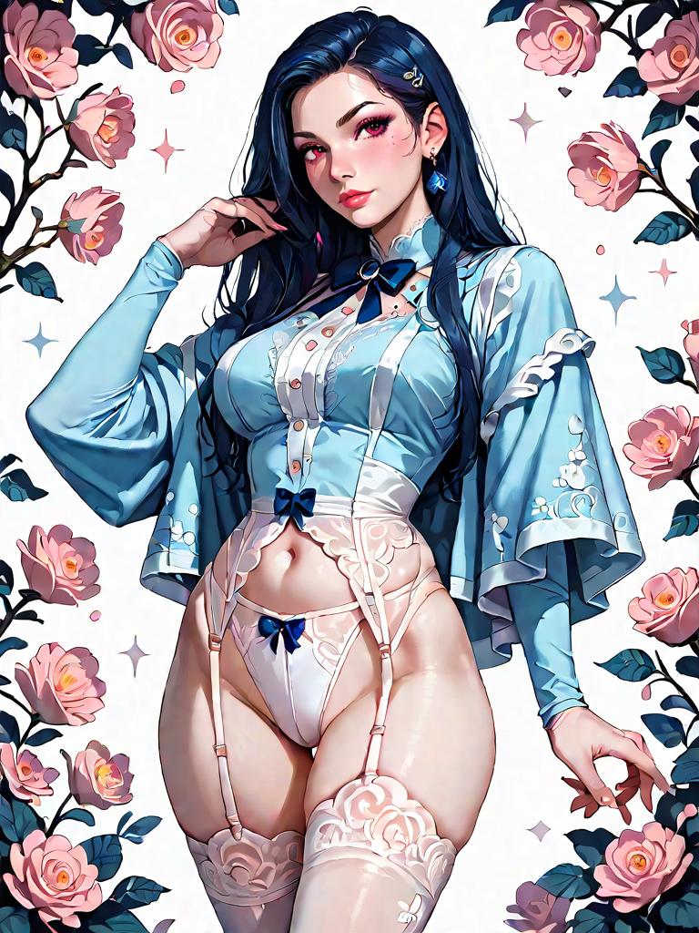 Illustration of a woman with long dark blue hair wearing a soft white bralette with underwire support, an intricate lace overlay, matching garter belt, and thigh-high stockings adorned with satin bows. The outfit features detailed floral patterns and sheer, breathable fabric. The background is decorated with pink roses and subtle stars, emphasizing a playful and flirty style.