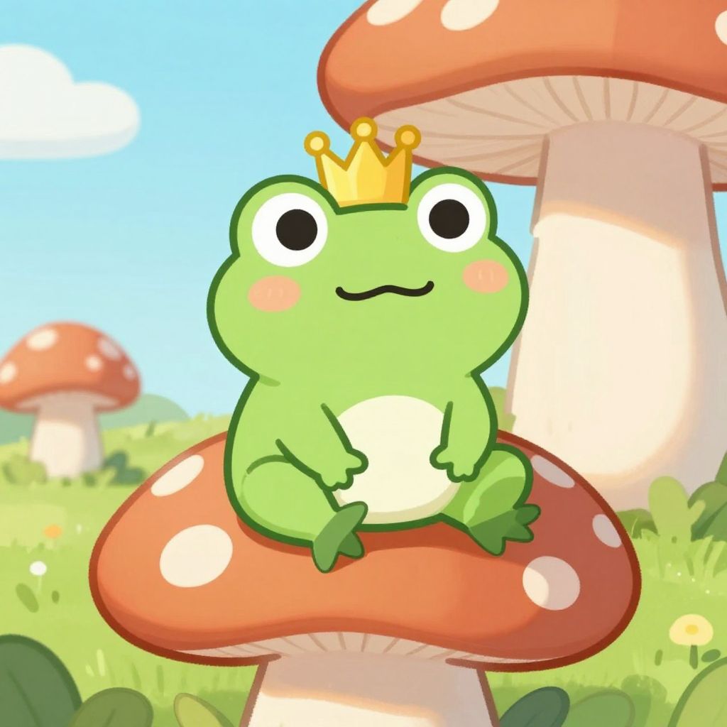 Frog cartoon character wearing a tiny crown, sitting on a giant mushroom, bright and cheerful, soft shading, fantasy storybook illustration, cute and friendly