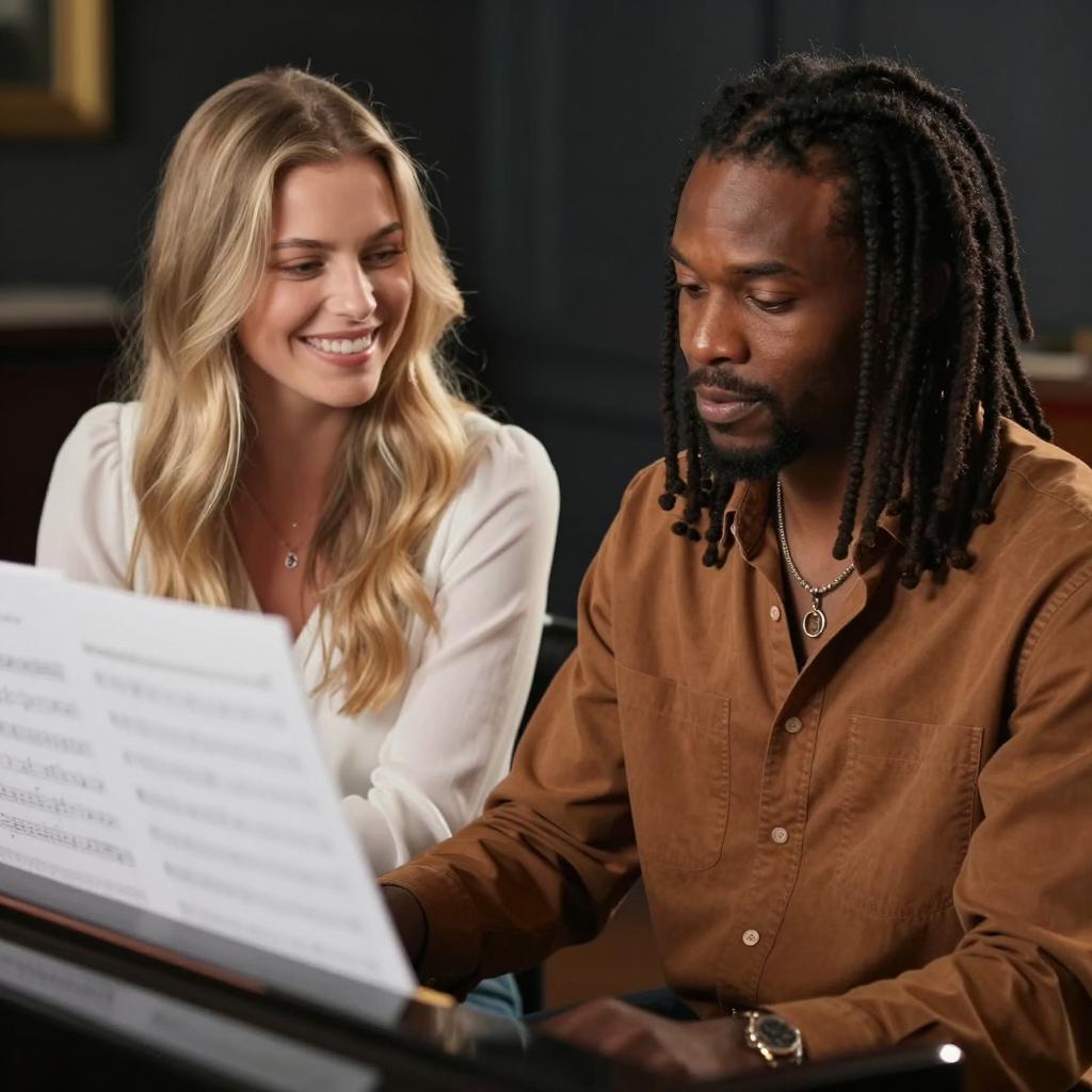 Two people sitting on stone steps in a rocky landscape. Man in beige suit, black hat, and dark shoes, with hands clasped. Woman in yellow dress with blonde hair, looking down. Stone steps lead up between rocks with green shrubs. Bright daylight.
