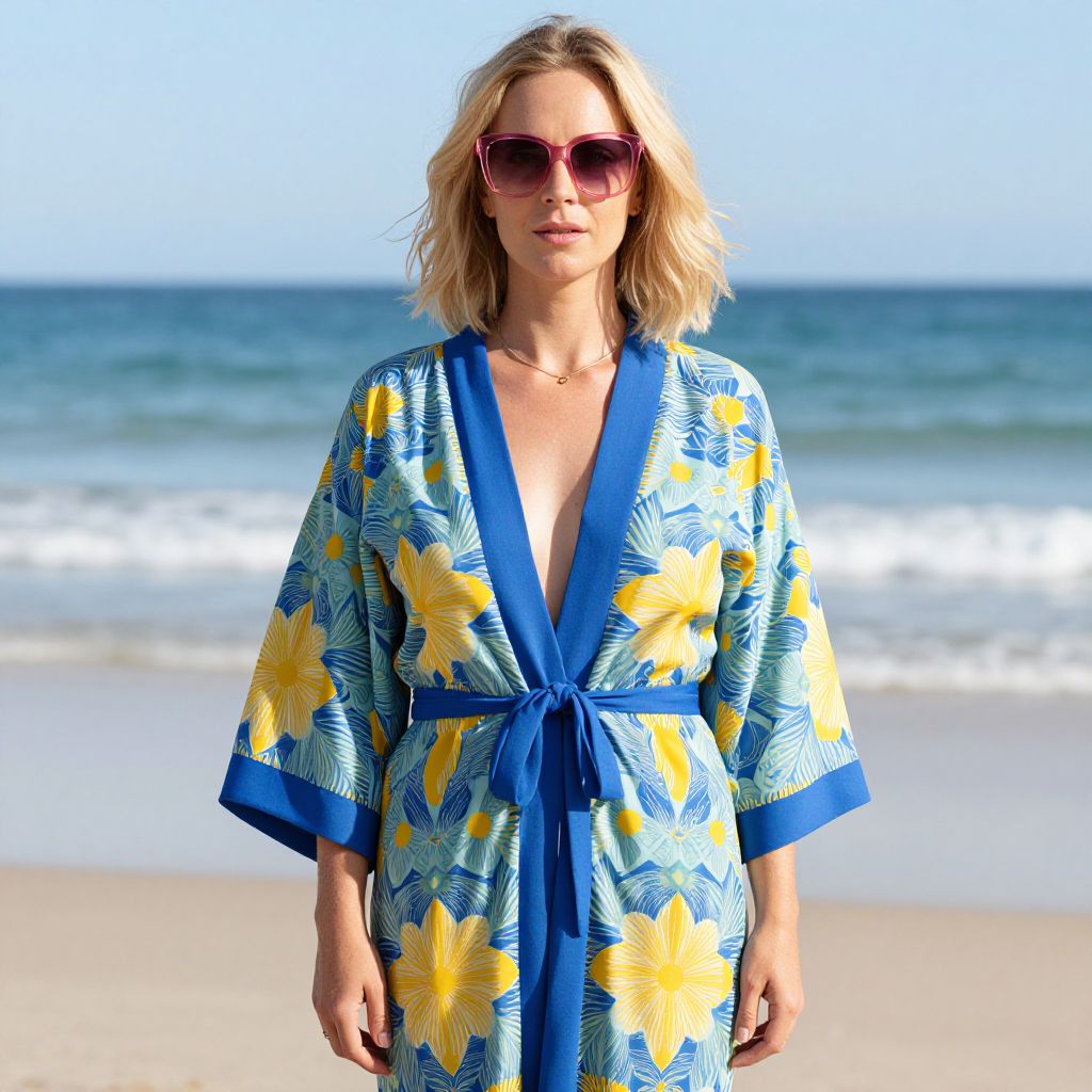 A woman with blonde hair and pink sunglasses stands on a beach, wearing a colorful kimono with blue and yellow patterns.