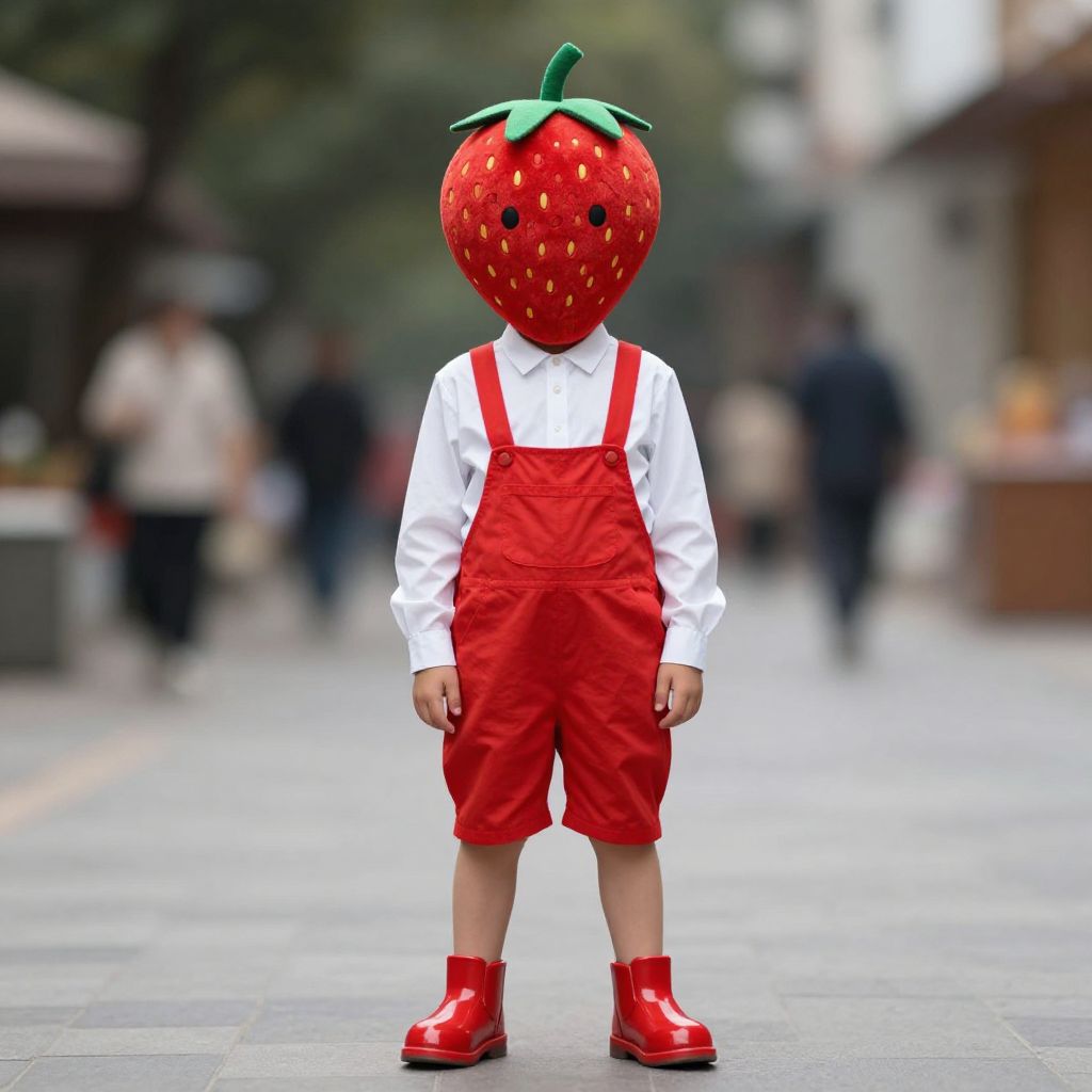 Boy strawberry costume fancy, solo, 1boy, male focus, fruit, shoes, food, blurry background, blurry, realistic, overalls, full body, standing, shirt, outdoors, white shirt, looking at viewer