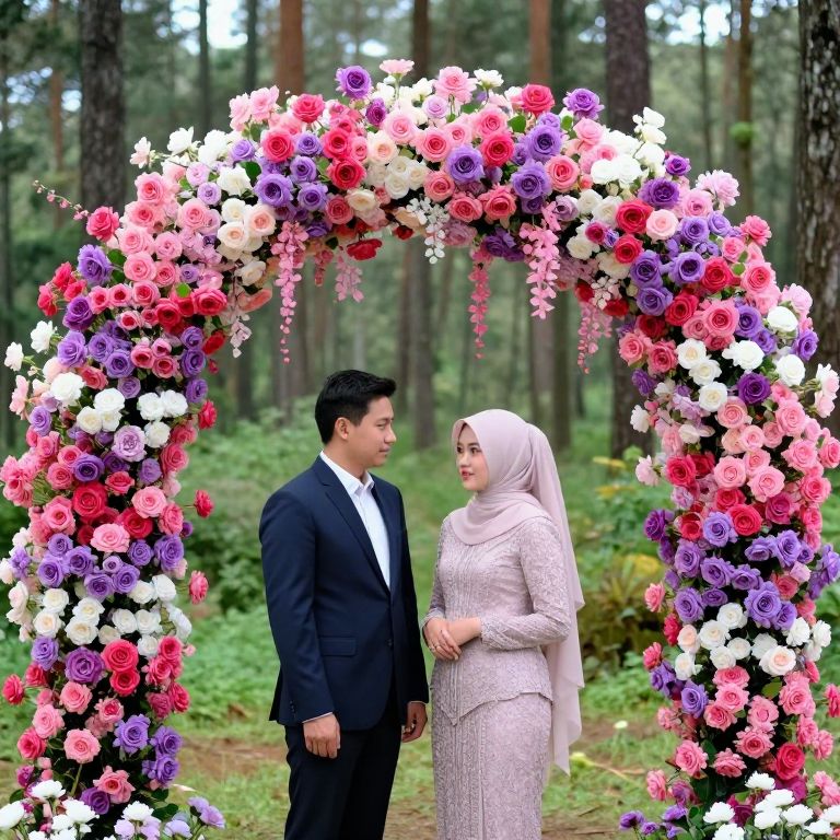 Gerry and Devina stand beneath a vibrant, circular floral arch adorned with cascading blooms of pink, purple, and white roses, creating a stunning engagement backdrop amidst the lush greenery of Pine Forest, Bandung.