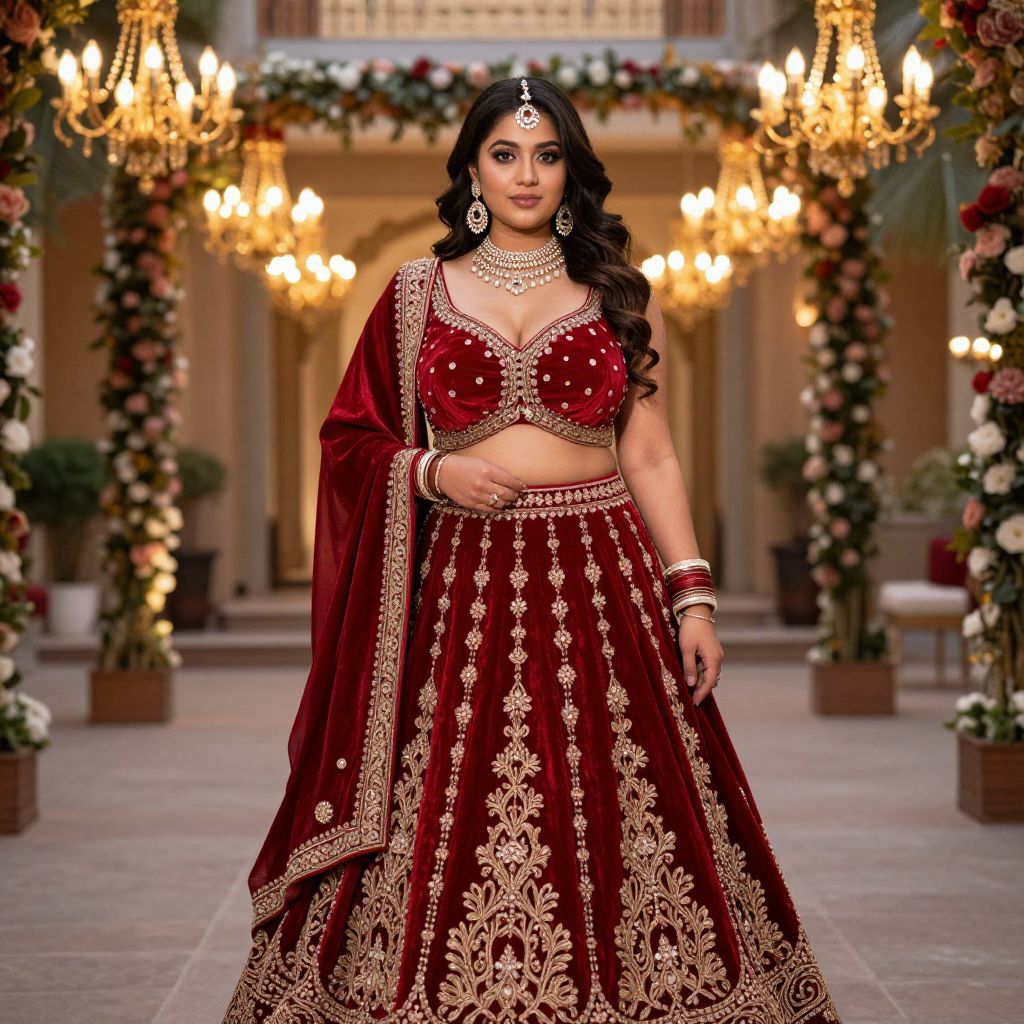 A vibrant and elaborate red velvet lehenga costume worn by a young Indian woman with warm brown skin, full curvy figure, and deep brown eyes, standing in a traditional wedding courtyard with golden chandeliers and floral arches, soft evening lighting, realistic photography style. The woman has big tits and cute face