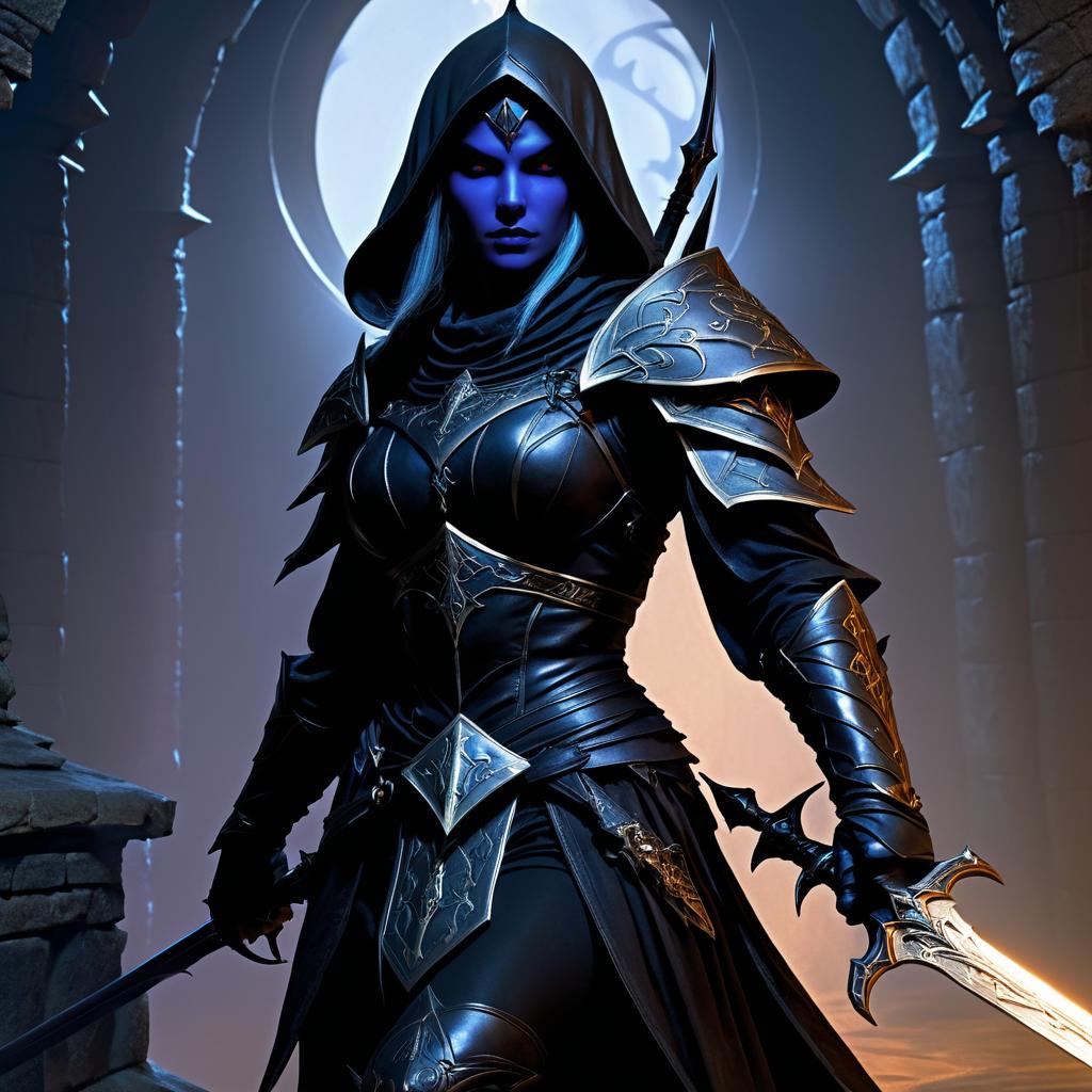 High detail illustration of a dark elf assassin clad in intricate black and silver armor with a hood, standing in a gothic stone archway under a full moon. The character holds a dagger and sword, exuding a mysterious and powerful presence with cinematic lighting highlighting the contours of the armor and intense facial expression. Fantasy setting inspired by The Elder Scrolls.