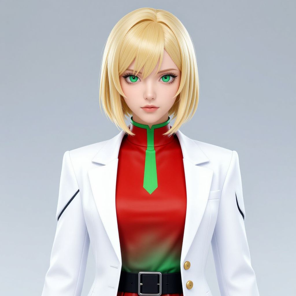 This is a digital CGI image of a young woman with a short, straight blonde bob haircut and striking green eyes. She wears a white, sharp-shouldered blazer with black trim over a red, high-neck shirt, accentuated by a vibrant green tie. A black belt with a gold buckle is visible at her waist. The background is a simple gradient from light blue to white, making the subject stand out. Her expression is neutral, and the overall style is reminiscent of anime or manga character design. The image has a clean, polished look with smooth textures and bright, contrasting colors.