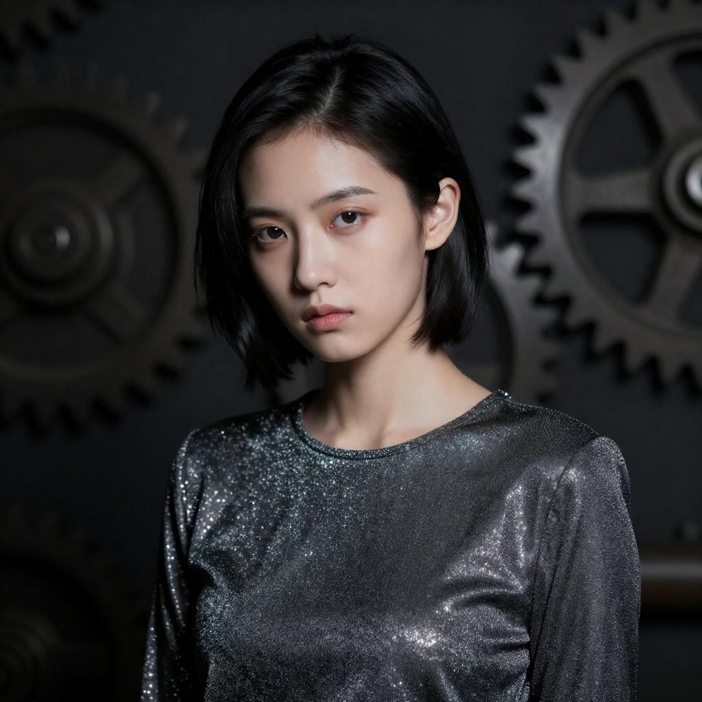 Photograph of a woman with pale skin and dark hair, wearing a red, high-collared garment, holding a black object close to her face. Her expression is intense and focused. Black background. Upper body shot. Single person.