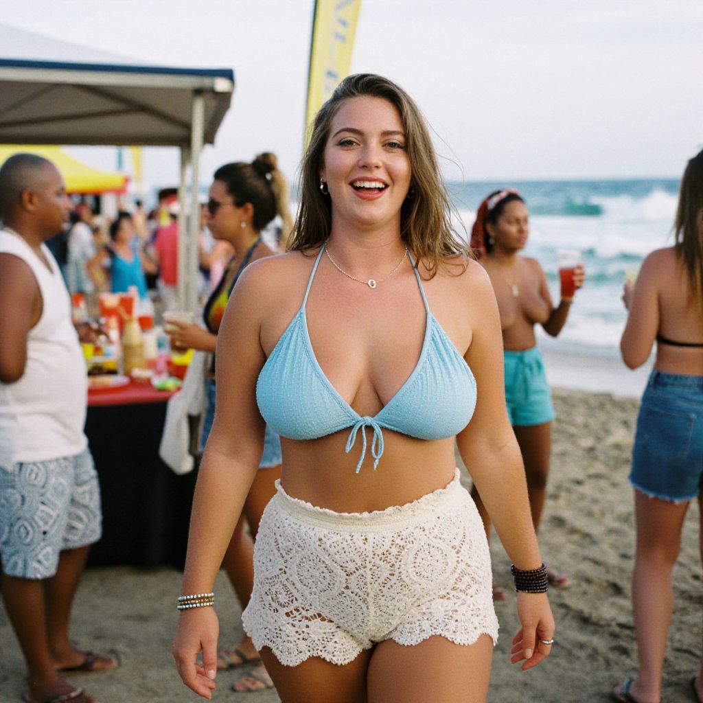 Photograph of a smiling, curvy woman with light brown hair, wearing a blue bikini top and white lace shorts, walking on a bustling beach with