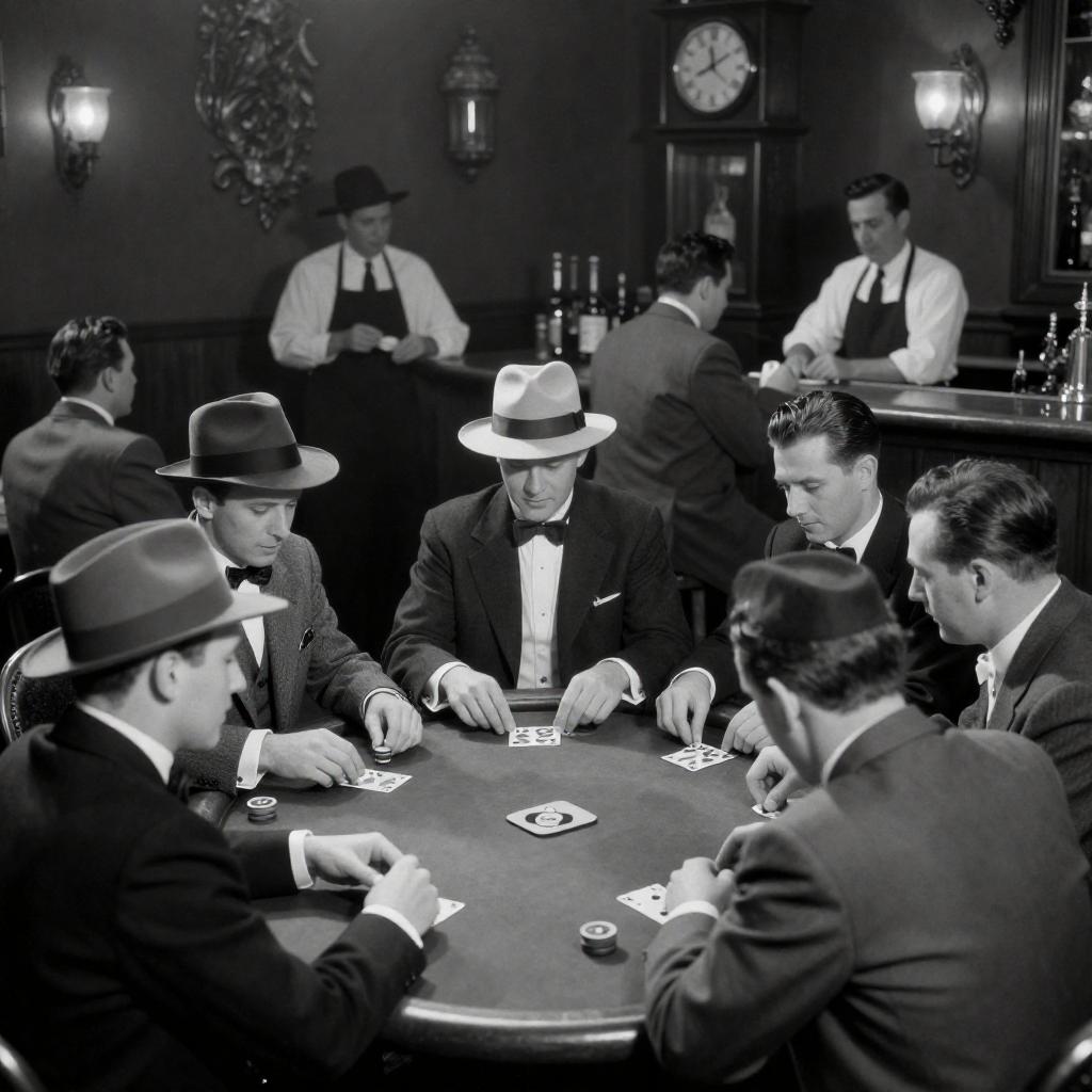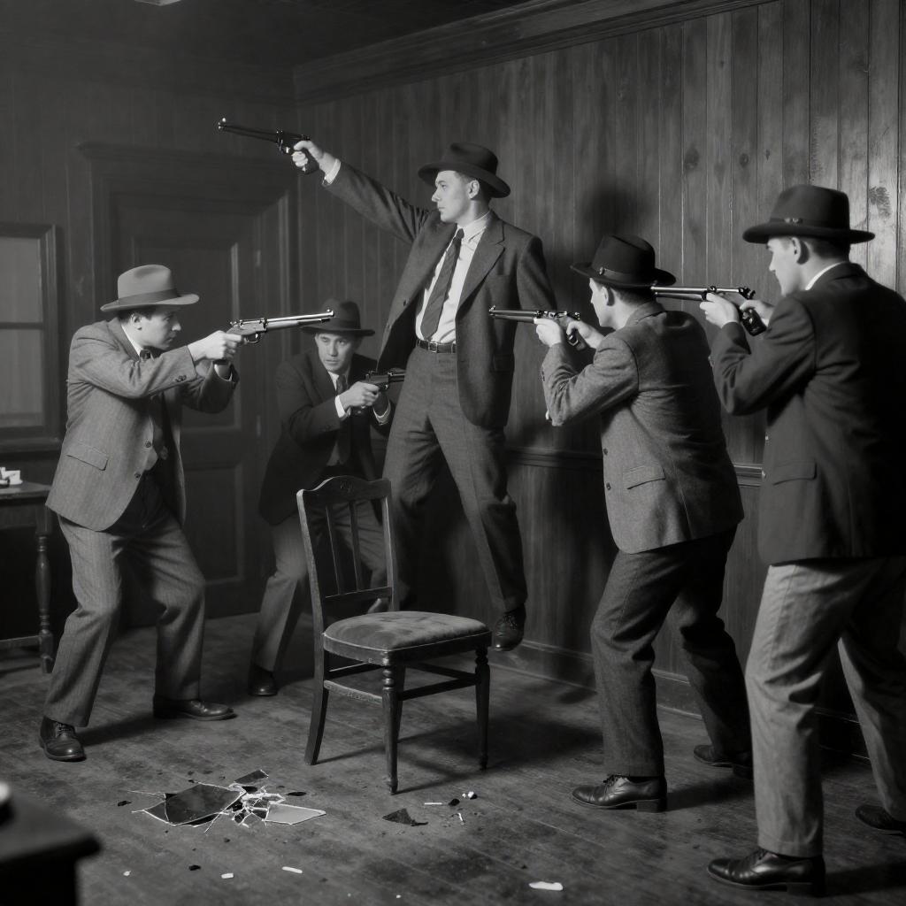 Black-and-white vintage photograph showing six men dressed in 1930s-style suits and fedoras engaged in a dramatic shootout inside a dimly lit, wooden-paneled room. One man is leaping from a chair with a gun raised while others crouch or stand, aiming revolvers. Broken glass and debris are scattered on the wooden floor, adding to the tense atmosphere.