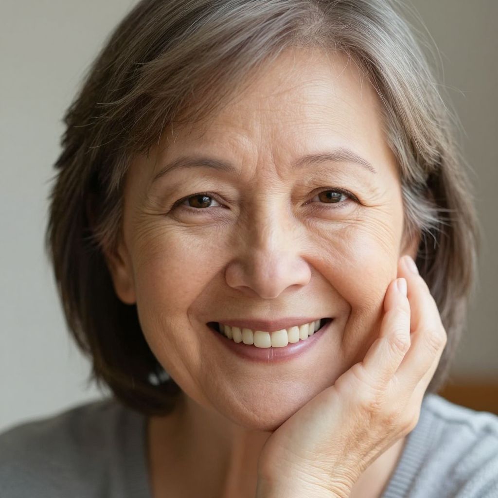 A close-up photograph of an older woman with short, wavy gray hair and fair skin, smiling warmly. She has brown eyes, light makeup, and is wearing small gold earrings and a dark blue top. Her right hand is gently resting on her cheek, showcasing well-manicured nails. The background is softly blurred, featuring neutral tones, which keeps the focus on her smiling face and expressive eyes. The lighting is natural, highlighting her wrinkles and giving her skin a healthy glow. The image has a warm, intimate feel.