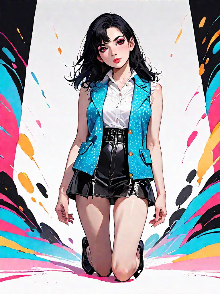 1girl, source_comics, realistic face, full body shot, Woman, playful novelty, tank dress with a graphic print resembling a game console, sleeveless, scoop neckline, contrasting trim at neckline and arms, mini length, black ankle boots with lace-up front and chunky heels, studio background