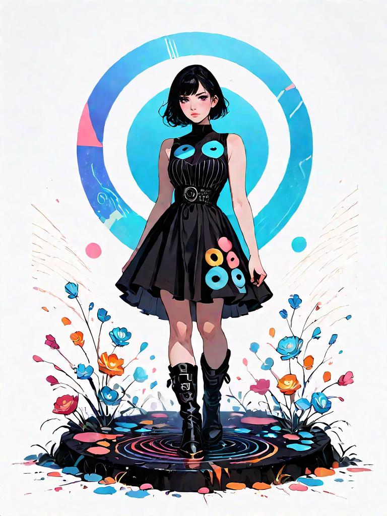 Full body illustration of a woman with short black hair wearing a sleeveless, mini-length tank dress featuring a colorful graphic print resembling a game console. She pairs the dress with black ankle boots with lace-up fronts and chunky heels. The background is a clean studio setting with playful colorful abstract elements.