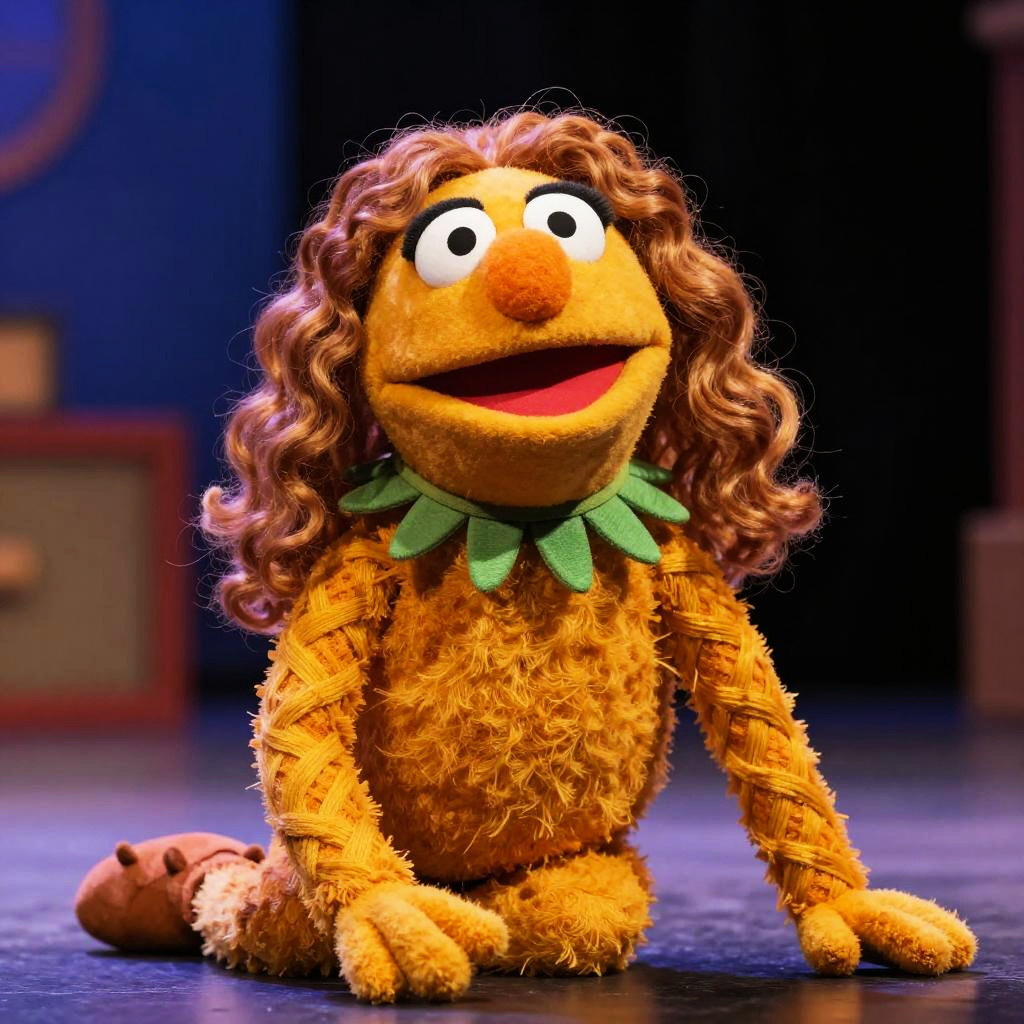 Long hair muppet posing on stage, luscious curly hair cascading down, bright vibrant colors, puppet theater setting, detailed fabric textures, joyful and expressive mood
