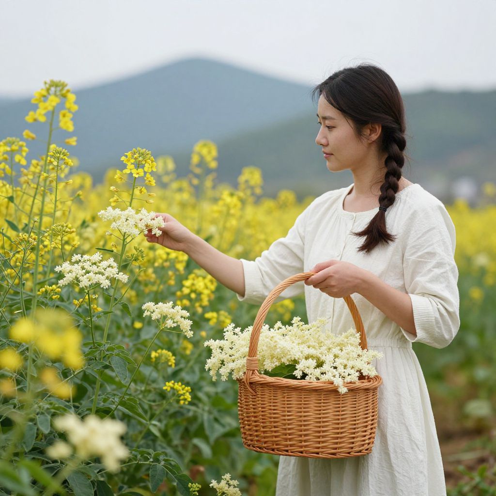 Woman harvesting vibrant elderflowers in a lush field, holding a wicker basket filled with delicate white blossoms amidst towering yellow blooms under a serene mountain backdrop.