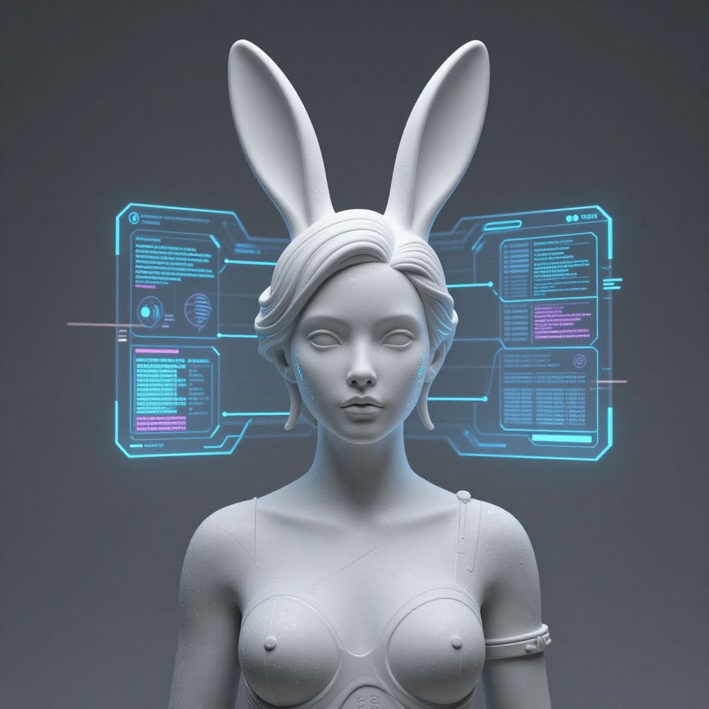 A futuristic sculpture of a woman with rabbit ears and a digital screen, representing the intersection of art, technology, and media in a tele-schizophrenic telenoia artificial intelligence simulacrum social construct.