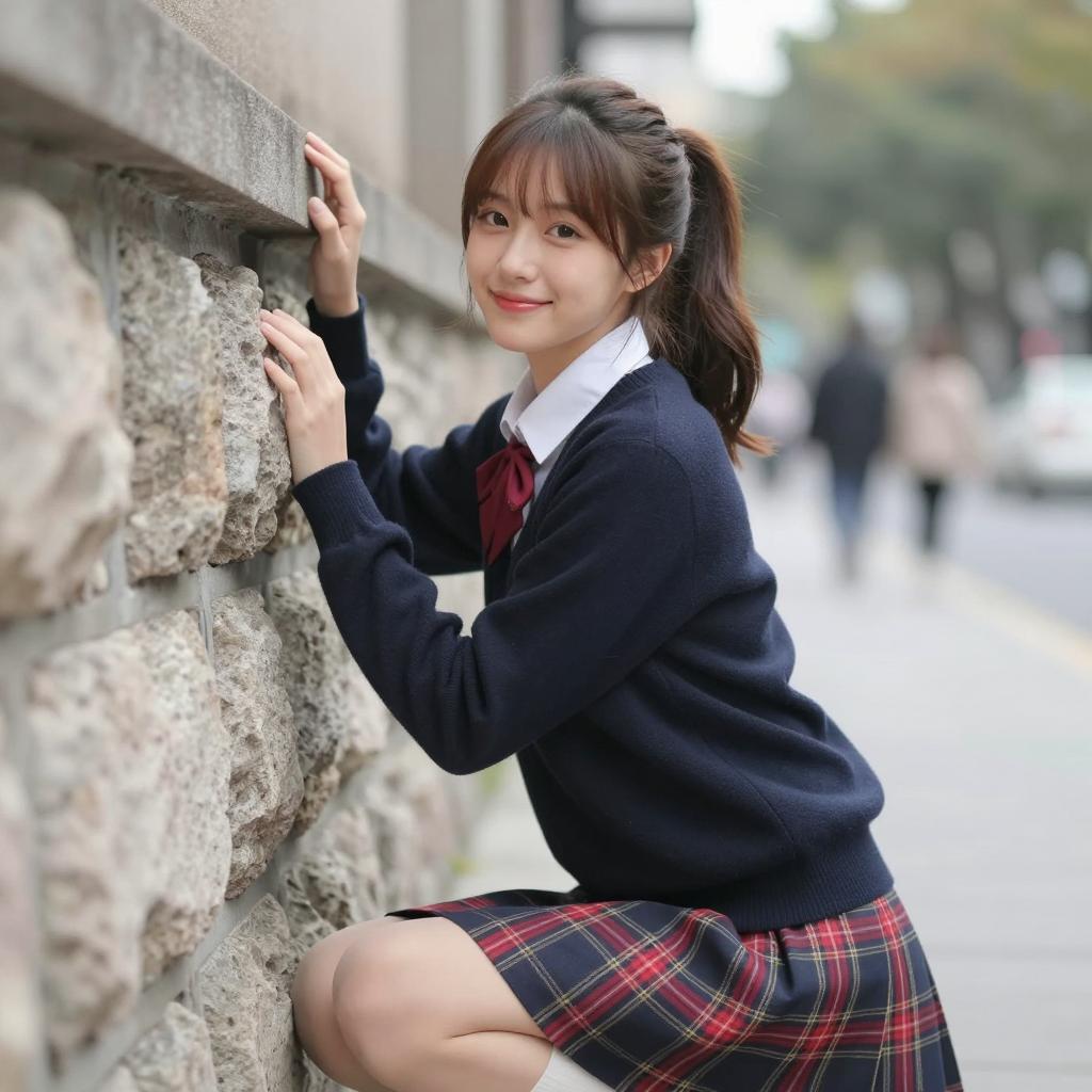 Asian woman with long brown hair in pigtails, wearing a white short-sleeve blouse, green pleated skirt, black knee-high socks, and black shoes, sitting on a concrete ledge. She smiles, legs crossed, background includes urban buildings and greenery.