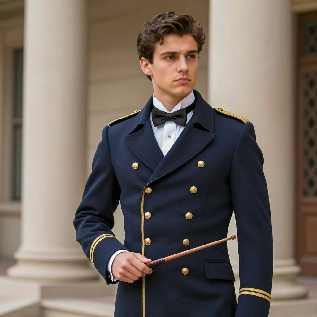 Photograph of a tall, clean-shaven man wearing a formal Victorian-style costume outdoors during daytime. He is dressed in a blue jacket with gold trim and buttons, cream vest, white cravat, and dark blue trousers with pink stripes. The man has brown hair and a serious expression, standing with hands in pockets against an ornate architectural background featuring a stone wall and lush green foliage, illuminated by warm sunlight.