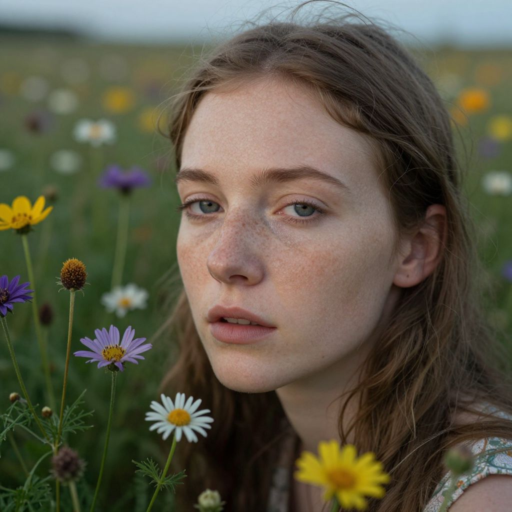 A close-up portrait from a bug's-eye perspective captures a Celtic woman with porcelain skin and delicate freckles amidst a sea of vibrant wildflowers in full bloom. Soft morning light caresses her face, accentuating the subtle lines around her eyes and revealing the smooth texture of her skin. Her gaze shifts from contemplative to wistful, conveying an emotional depth that mirrors nature's beauty and humanity's complexities. The surrounding landscape is rendered with meticulous detail—from intricate flower petals to lush greenery—immersing viewers in a serene, tranquil world.