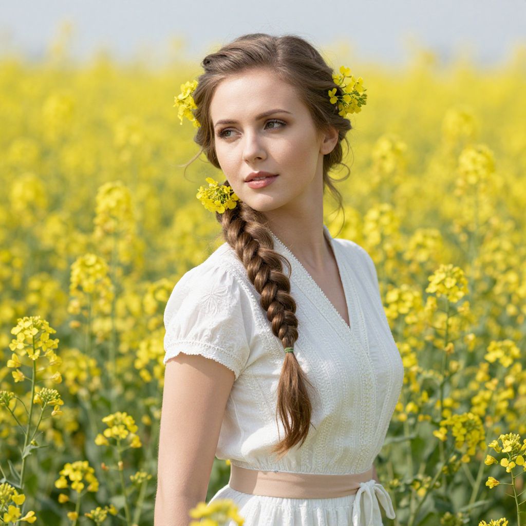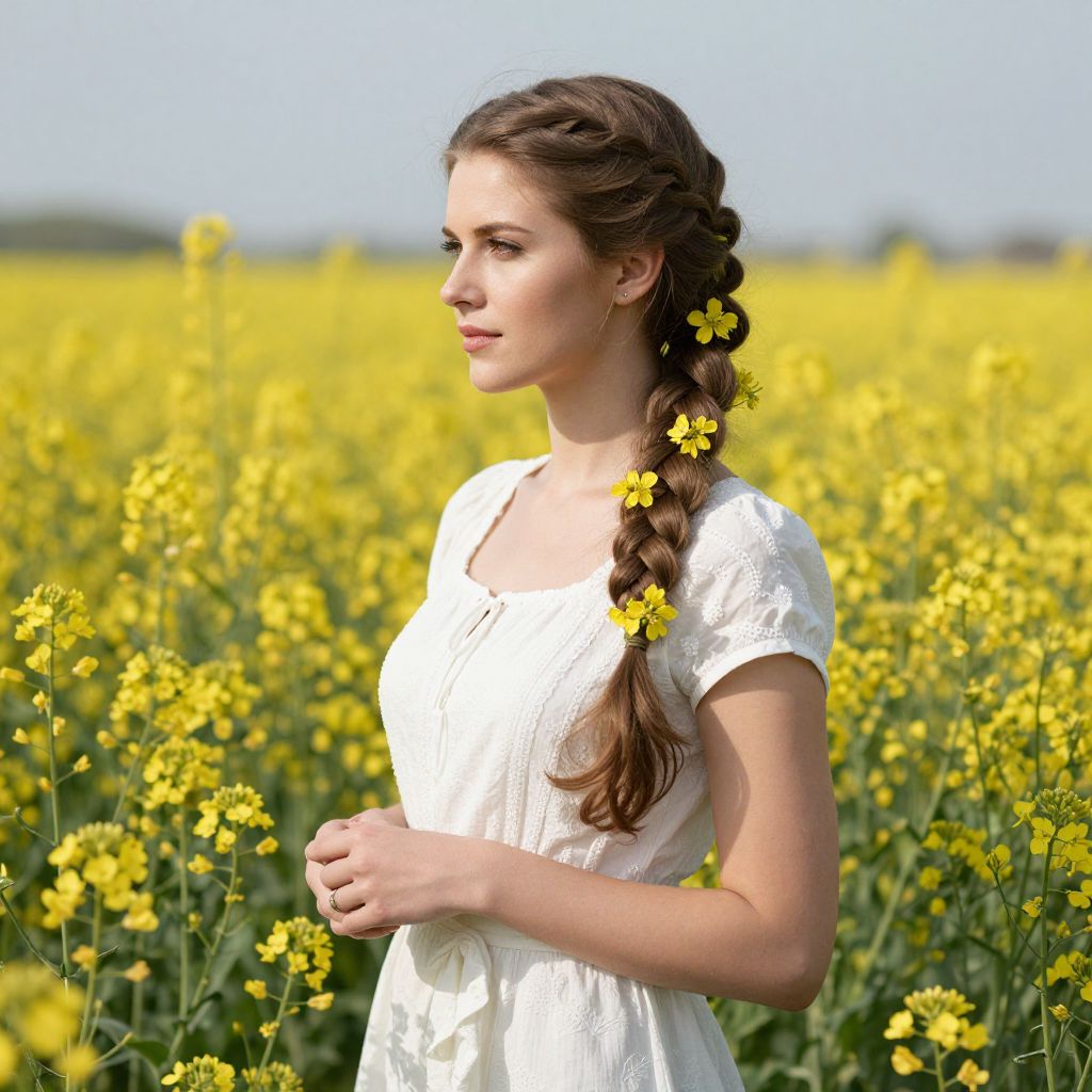 A serene European woman with a meticulously braided hairstyle adorned with vibrant yellow flowers stands gracefully in a sunlit field of blooming colza, captured in a high-definition, naturalistic style that emphasizes the harmonious blend of her elegant attire and the lush, golden surroundings.