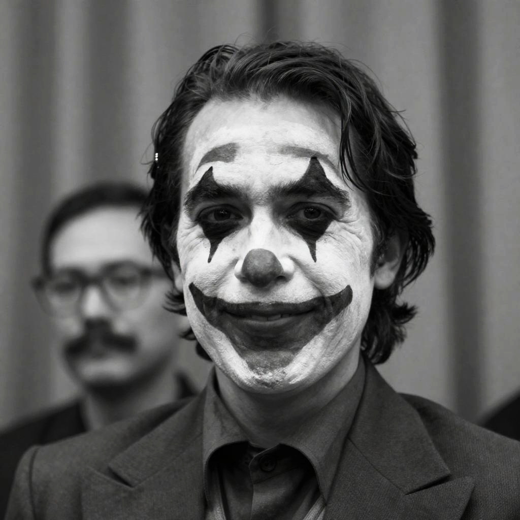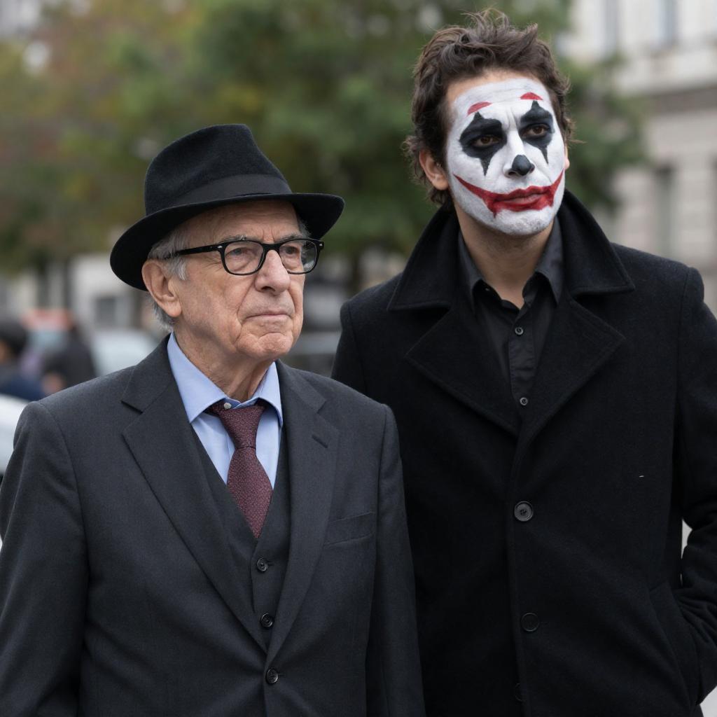 Photograph of an older man with glasses, black hat, and suit standing beside a younger man with dark hair, white face paint, and black coat. The older man looks to the side, while the younger man gazes forward. Background includes blurred greenery and urban elements.