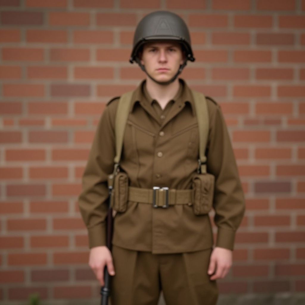 Photograph of a young Caucasian man standing against a red brick wall. He wears a dark brown military uniform with a black helmet, olive-green webbing, and a belt with pouches. His expression is neutral, and he holds a rifle with his right hand by his side. The uniform is buttoned up, and the fabric appears sturdy and military-issue. The background is a simple, evenly spaced red brick wall, and the lighting is even, highlighting the uniform and his serious demeanor.