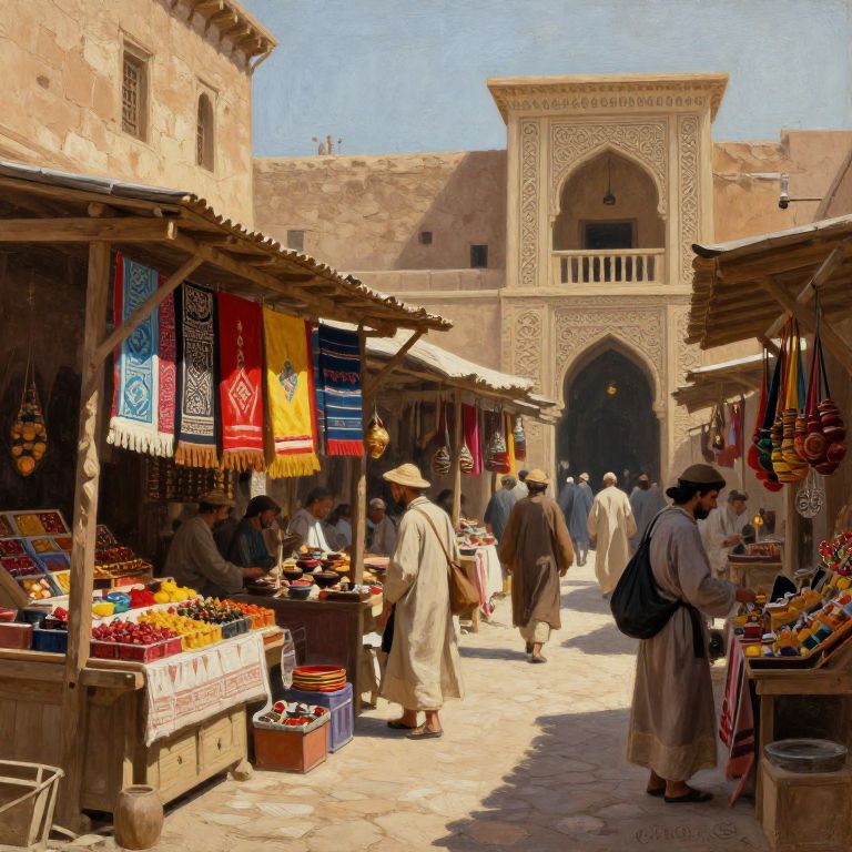 Photograph of a vibrant Middle Eastern bazaar with colorful textile stalls, stone archway, and shoppers in traditional attire under bright sunlight.