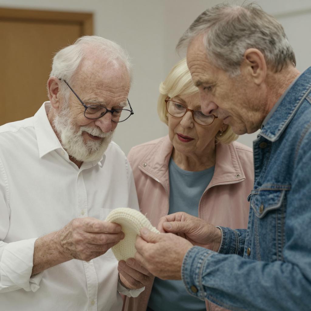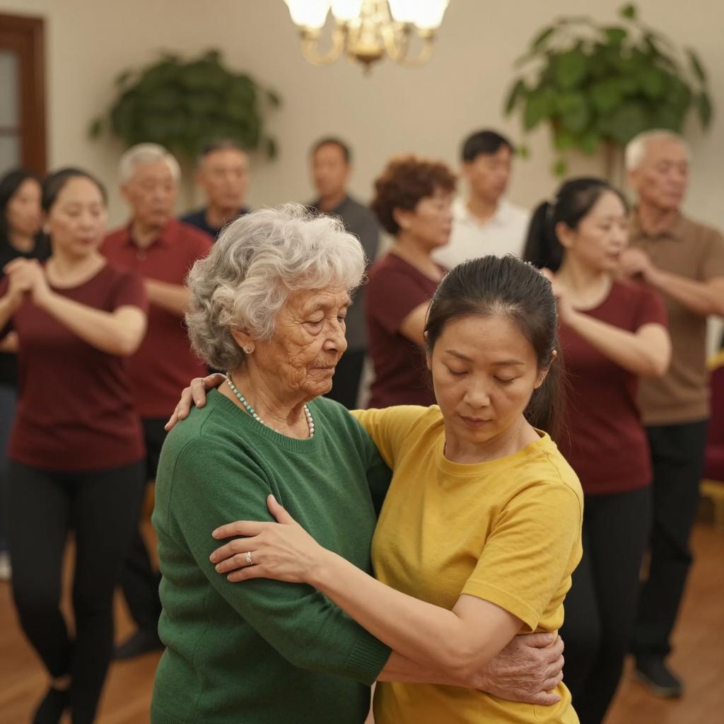 A group dance scene. Elder woman with short, curly gray hair in a green sweater dances with a younger woman with dark hair in a yellow top. Background: 12 people in red and brown clothing, blurred. Warm lighting, chandelier, green plants. Elder woman's right hand on younger woman's left shoulder. Younger woman's head down, eyes closed. Elder woman's face focused.