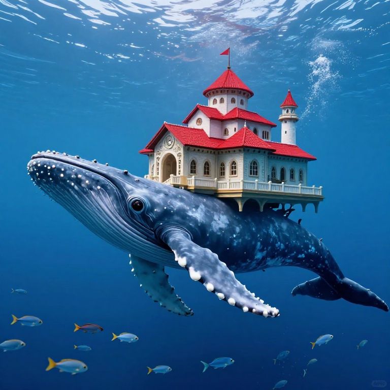 A colossal whale gracefully carries a grand, red-roofed palace on its back, defying gravity as it glides through the ocean, while schools of fish swim serenely beneath this surreal aquatic kingdom.