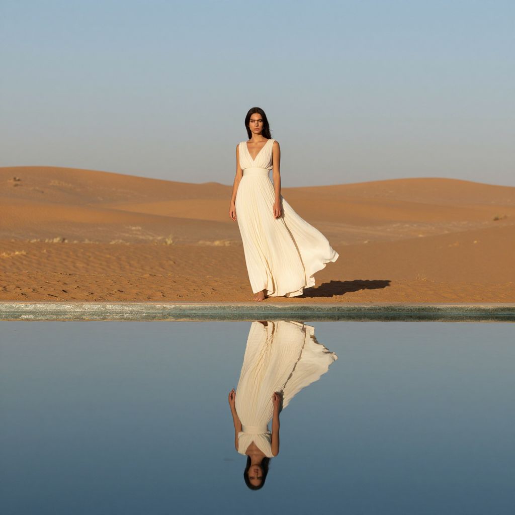 Woman standing barefoot by a tranquil pool in a vast desert landscape, her flowing cream gown mirrored perfectly in the still water, creating an ethereal reflection that blends seamlessly with the arid surroundings.