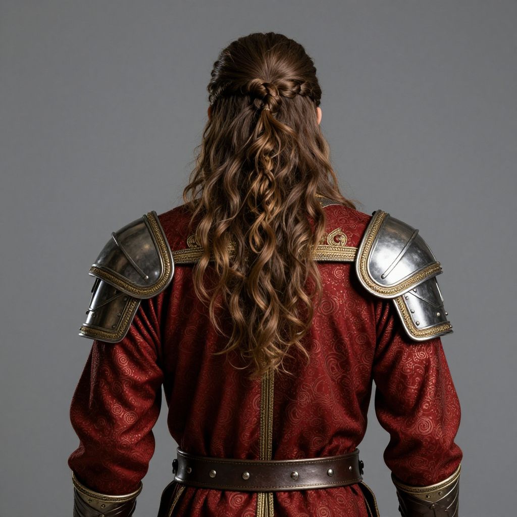 Photograph of a character with long, wavy brown hair in a braid, wearing a red, textured medieval tunic with silver shoulder armor,