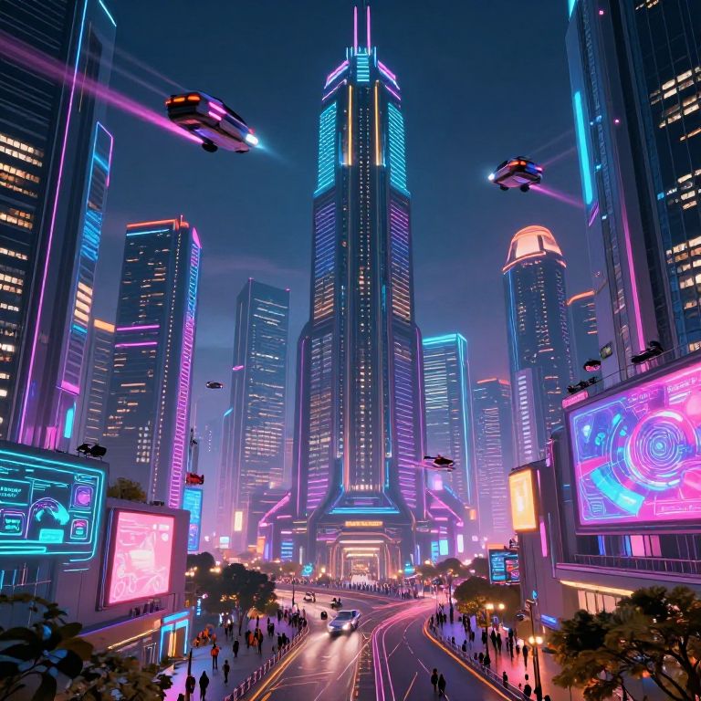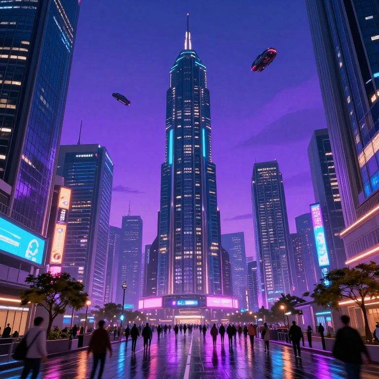 Neon-lit, futuristic cityscape photograph of a towering skyscraper at dusk, surrounded by flying cars, colorful lights, and bustling pedestrians.