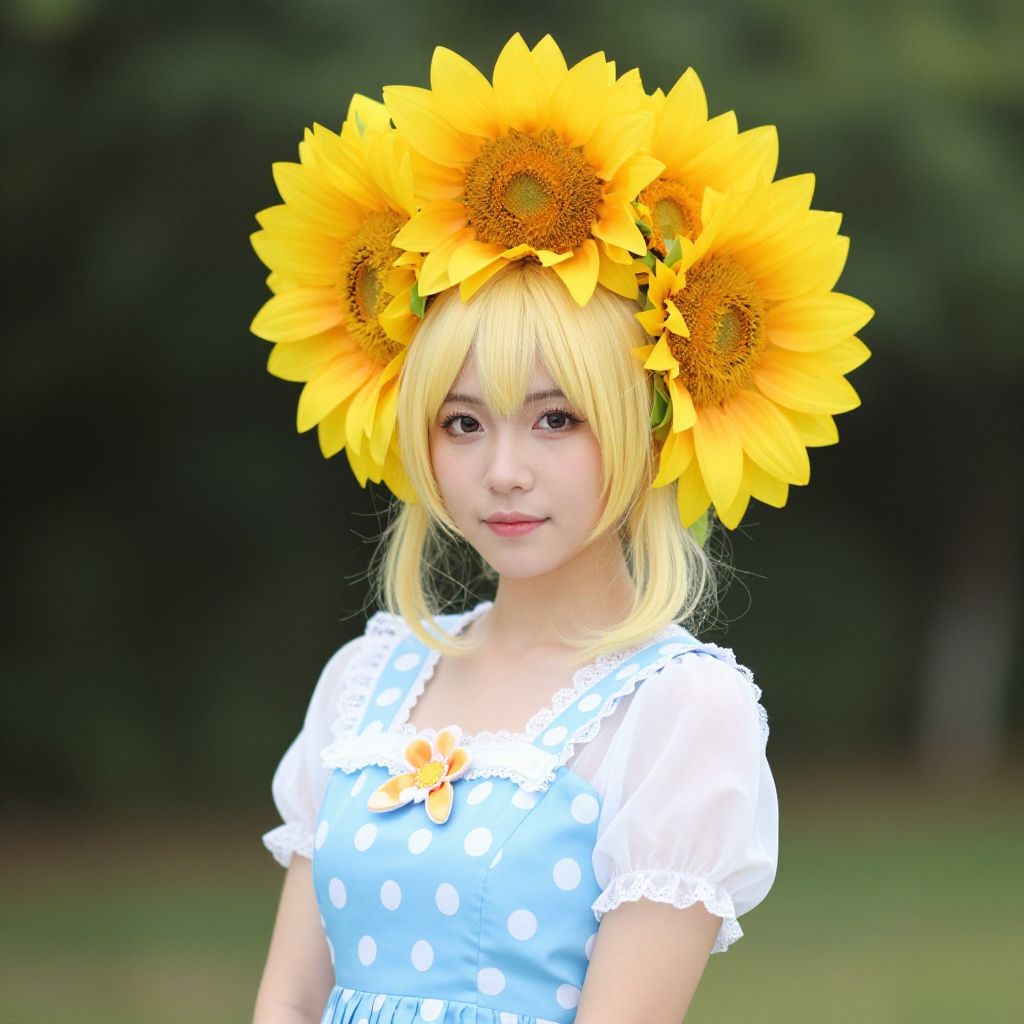 A woman dressed in a whimsical cosplay outfit featuring a blue polka-dot dress adorned with a flower brooch, complemented by an elaborate headdress of large, vibrant yellow sunflowers. The photorealistic portrait captures a dreamy, artistic vibe against a natural outdoor backdrop.