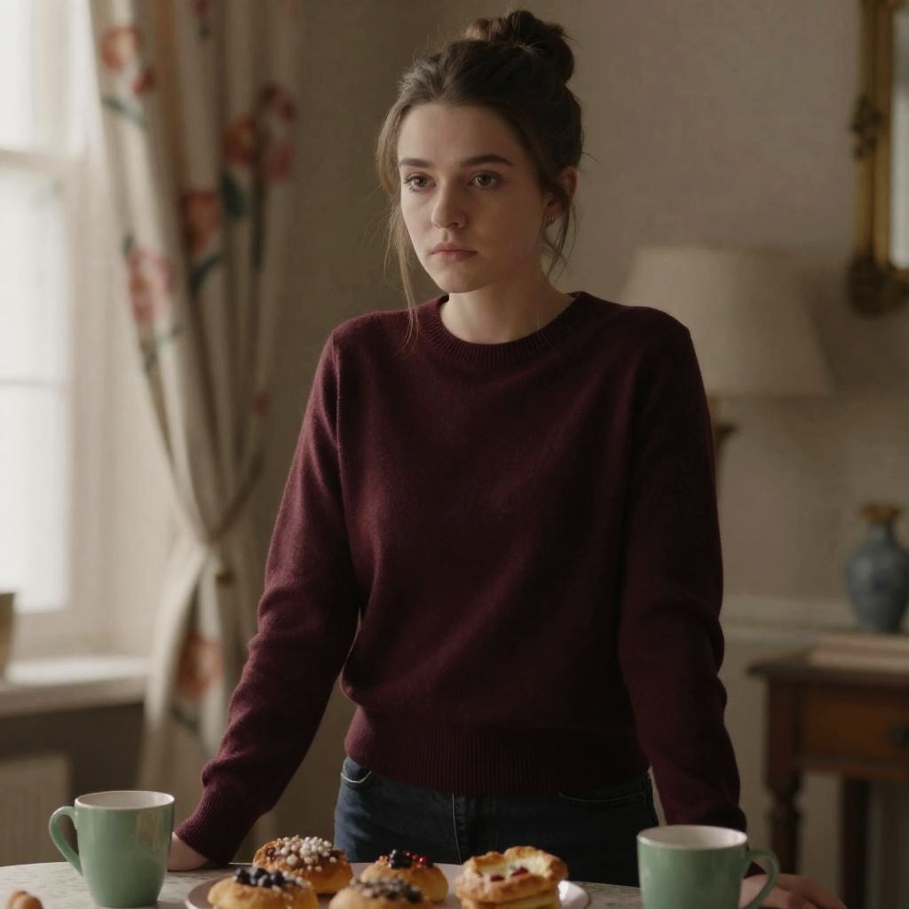 Young woman with light skin, brown hair in a bun, wearing a dark maroon sweater, standing by a table with pastries and green mugs. Background: floral curtains, window, lamp. Soft, natural light. Serious expression. Indoor setting.