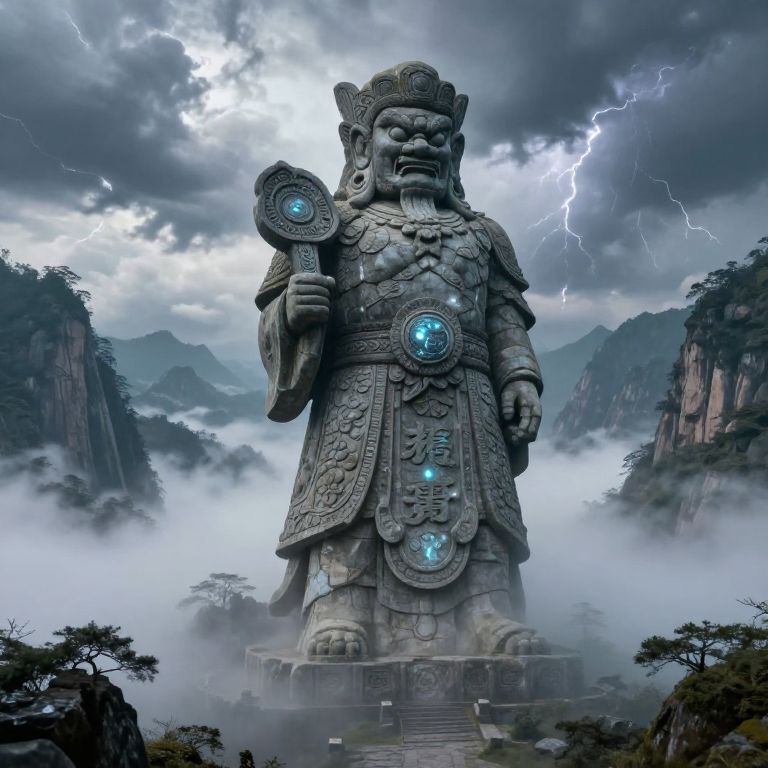 Gigantic stone statue of a fierce, armored deity with glowing blue orbs, lightning in the stormy sky, misty mountains, and dramatic clouds