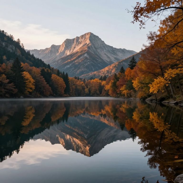 An ethereal mirror of serenity reflects the soul of autumn, where still waters cradle the whispers of ancient mountains, inviting contemplation amidst the timeless beauty of nature.