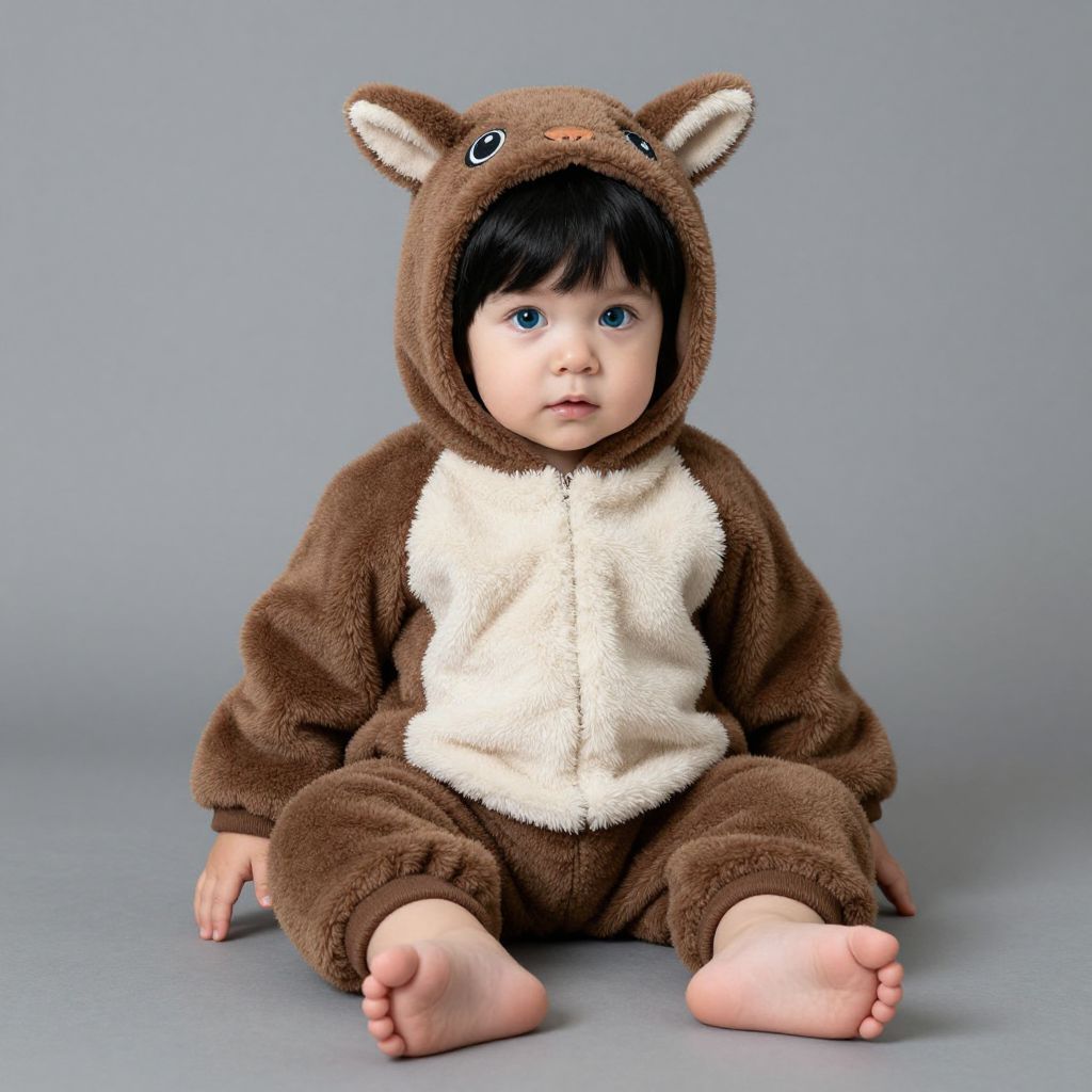 Photograph of a cute baby with fair skin and black hair, wearing a brown and white teddy bear onesie, sitting on grey floor against a