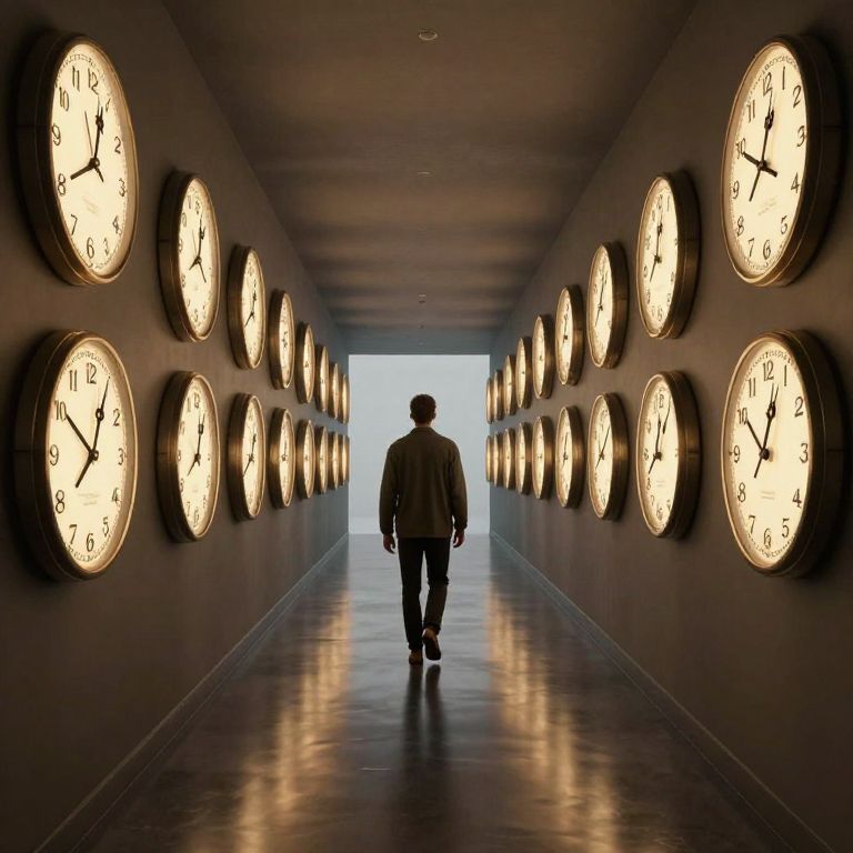 A surreal 3D-rendered corridor lined with identical clocks on either side, featuring dramatic lighting and reflective floors, creates a mirrored labyrinth where a solitary figure walks forward, evoking themes of time manipulation and temporal distortion.