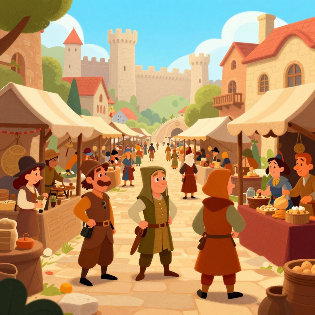 This vibrant digital illustration depicts a medieval market scene. In the foreground, three animated characters with exaggerated, cartoonish features stand on a cobblestone street. They wear medieval-style clothing: one with a green hooded tunic, another in brown with a belt, and the third in a brown tunic with a hat. Surrounding them are market stalls with beige canopies, displaying goods like bread and pottery. Shoppers, also in medieval attire, browse the stalls under a bright blue sky. In the background, a castle with tall towers and red roofs looms, flanked by green trees. The scene is bustling with activity, capturing a lively, festive atmosphere.