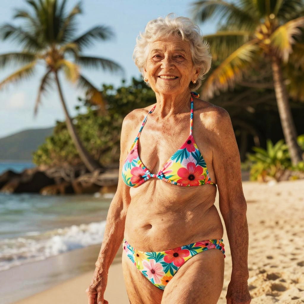 Grandma bikini surfing at sunrise, energetic senior woman catching a wave, wearing a colorful sporty bikini, dynamic water splashes, warm early morning light, expressive and adventurous mood, realistic digital painting