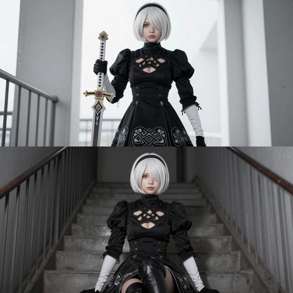 Cosplayer with short silver hair, black dress, long gloves, thigh-high stockings, and black heels, stands on rocks holding a large sword. Background has a rocky waterfall and greenery. Sunlight filters through trees. She has a confident stance, looking to the side. Her expression is neutral. Outdoor setting.