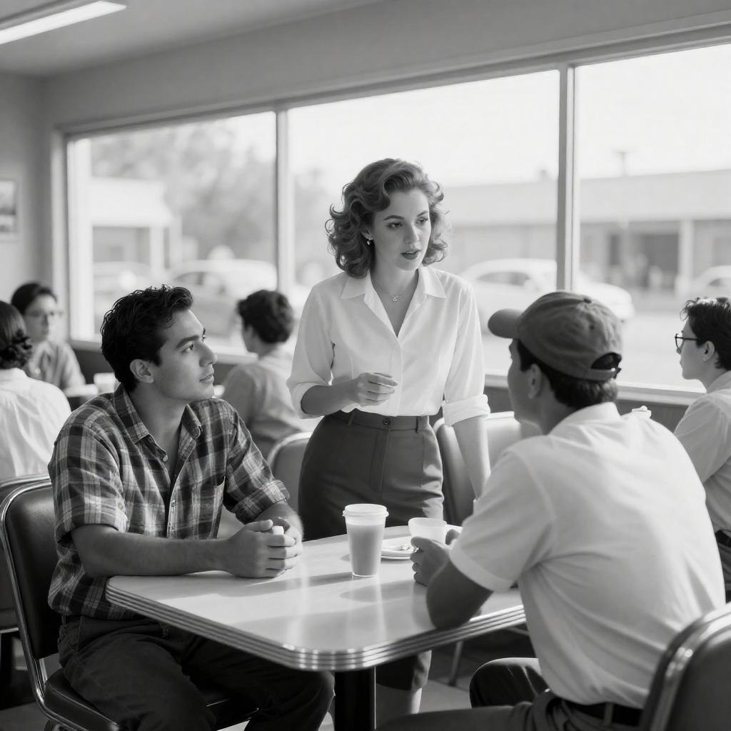 Black-and-white photograph of a retro diner scene. A woman with curly hair and a white blouse stands, talking to a man in a cap and white shirt seated at a table. Other patrons, including a man in a plaid shirt and a woman with glasses, sit in the background. Sunlight streams through large windows, illuminating the scene.