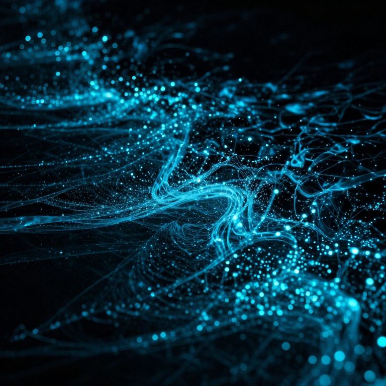 Waves of bioluminescent particles cascade across a textured, flowing surface, creating a mesmerizing display of light and motion against a dark backdrop.
