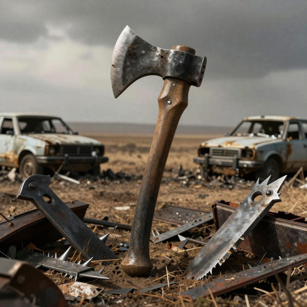 Post apocalyptic axe with spiked blade, surrounded by broken weapons and scrap metal, barren wasteland horizon, exploded vehicles, harsh and gritty texture