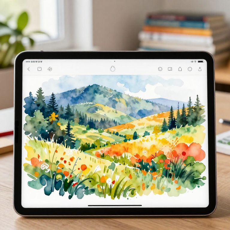 Realistic drawing app open on a tablet with a stunning digital watercolor landscape, vibrant colors flowing seamlessly with brush strokes, clean user interface with intuitive toolbars, ambient daylight flooding a creative room stacked with art books and plants