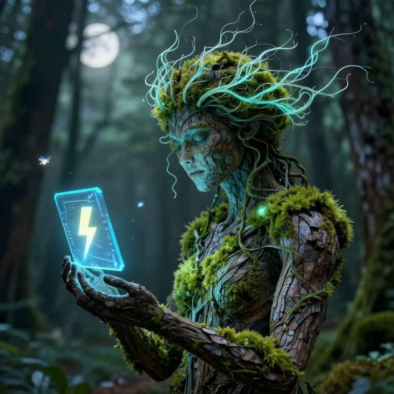 A hyper-realistic close-up of a person standing in a dense forest, their skin resembling textured bark, with soft, glowing moss growing along their arms and neck, Their hair flows upward, transforming into delicate, bioluminescent vines that gently curve into the air, In one hand, they hold a small, holographic sign with a glowing blue and yellow thunderbolt symbol pulsing softly, The forest around them is bathed in soft moonlight, with ethereal, glowing insects fluttering nearby, The atmosphere is tranquil, with the subtle glow of the person’s moss-covered skin and the floating sign casting a faint light on the surrounding trees